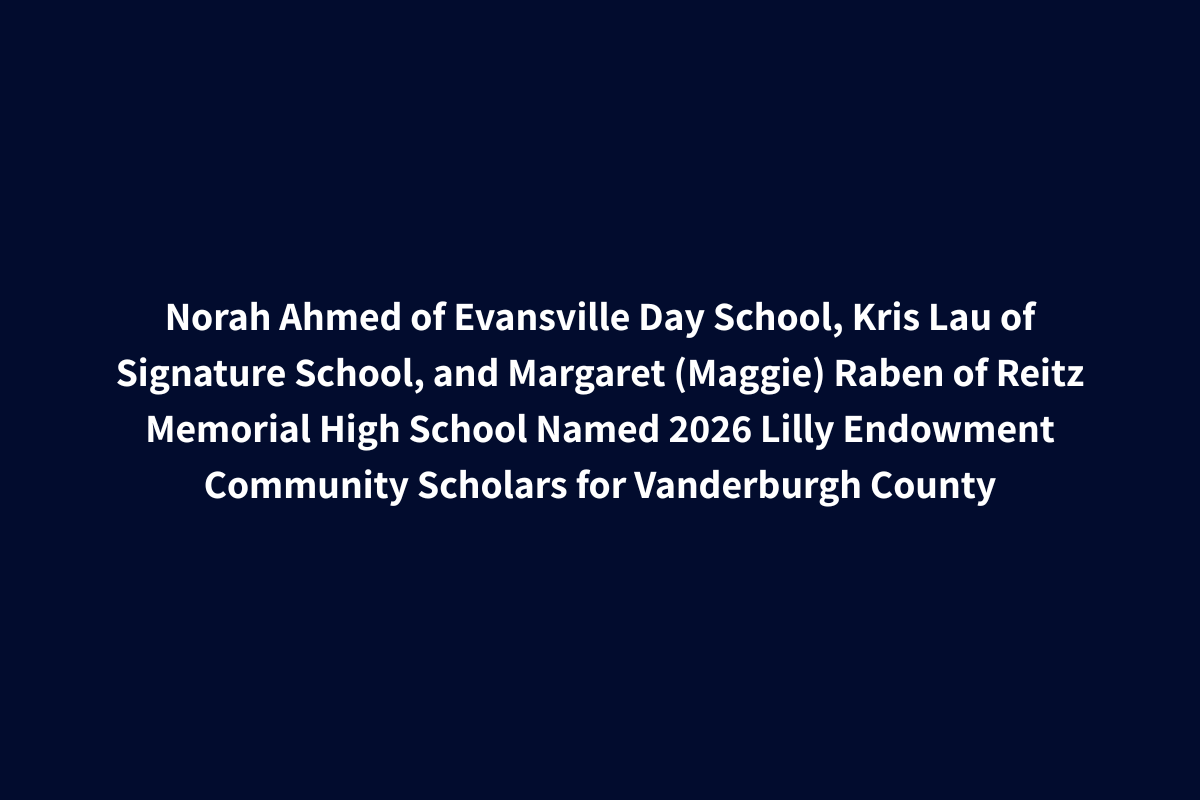 Vanderburgh Community Foundation is pleased to announce the recipients of the 2026 Lilly Endowment Community Scholarship for Vanderburgh County: Norah Ahmed of Evansville Day School, Kris Lau of Signature School, and Margaret (Maggie) Raben of Reitz Memorial High School. Lilly Endowment Community Scholars are recognized for their community involvement, academic achievement, character, and leadership. "All of this year’s Lilly Endowment Community Scholarship Program recipients from Vanderburgh County exemplify excellence both in and beyond the classroom. Their dedication to academics, community engagement, and leadership stood out throughout the scholarship process, reflecting a level of maturity and purpose well beyond their years," said Alysia Rhinefort, Regional Director of Community Engagement and Impact. Each Lilly Endowment Community Scholarship provides full tuition, required fees, and up to $900 per year for required books and equipment for four years of full-time undergraduate study leading to a baccalaureate degree at any eligible Indiana public or private nonprofit college or university. Scholars also join the Lilly Scholars Network (LSN), which connects them with resources and opportunities to lead on campus and in their communities. Both the scholarship program and LSN are supported by grants from Lilly Endowment to Independent Colleges of Indiana (ICI). "I am extremely honored to be a recipient of this incredible opportunity! I am deeply grateful to God and to all those who have supported me in reaching this milestone. I have not decided where I will attend next year, but I plan to pursue a pre-med track. I look forward to seeing how this honor will shape my future and guide my service to Indiana," said Margaret (Maggie) Raben, Lilly Endowment Community Scholar. In nominating Vanderburgh’s Lilly Endowment Community Scholars, the committee considered academics, community involvement, extracurricular activities, work experience, honors and awards, personal statement and goals, essay, and impromptu essay and interview. After narrowing the field of applicants, nominees were submitted to Independent Colleges of Indiana (ICI), the statewide administrator of the program, for final selection. Since its inception in 1997-1998, Lilly Endowment has supported this program with tuition grants totaling more than $505 million, benefiting over 5,400 Indiana students. The program’s primary purposes are: To raise the level of educational attainment in Indiana. To increase awareness of the beneficial roles Indiana community foundations play. To encourage and support Lilly Scholars’ engagement with Indiana leaders to improve quality of life statewide. About the Vanderburgh Community Foundation Established in 1992, the Vanderburgh Community Foundation is a charitable resource devoted to our local community. We help people make meaningful gifts that improve life in Vanderburgh County today and for generations to come. One of nine county affiliates of the Community Foundation Alliance, the Community Foundation exists to help caring people give back to the causes and community they care about most. The Community Foundation Alliance is a 501(c)(3) public charity accredited by the National Standards for U.S. Community Foundations® (National Standards) program representing operational effectiveness to foster excellence in community philanthropy. Since the inception of this program, the Community Foundation Alliance has consistently achieved National Standards accreditation. The Community Foundation Alliance provides management, administrative, and development expertise and services so that every local affiliate can focus on promoting philanthropy, building endowment, and grantmaking, making a difference in their community For Good. Forever. About Lilly Endowment Inc. Lilly Endowment Inc. is an Indianapolis-based private philanthropic foundation created in 1937 by J.K. Lilly Sr. and his sons Eli and J.K. Jr. through gifts of stock in Eli Lilly and Company. The Endowment supports community development, education, and religion, with a special commitment to Indianapolis and Indiana. About Independent Colleges of Indiana (ICI) Founded in 1948, ICI serves as the collective voice for Indiana’s 29 private, nonprofit colleges and universities. ICI institutions employ over 22,000 Hoosiers and generate a local economic impact of over $5 billion annually. Students at ICI colleges have Indiana’s highest four-year graduation rates and produce 30% of Indiana’s bachelor’s degrees while enrolling 20% of its undergraduates.